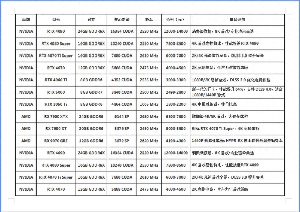 以下是截至2025年5月2日的最新显卡型号、规格及推荐理由(价格单位为人民币):
